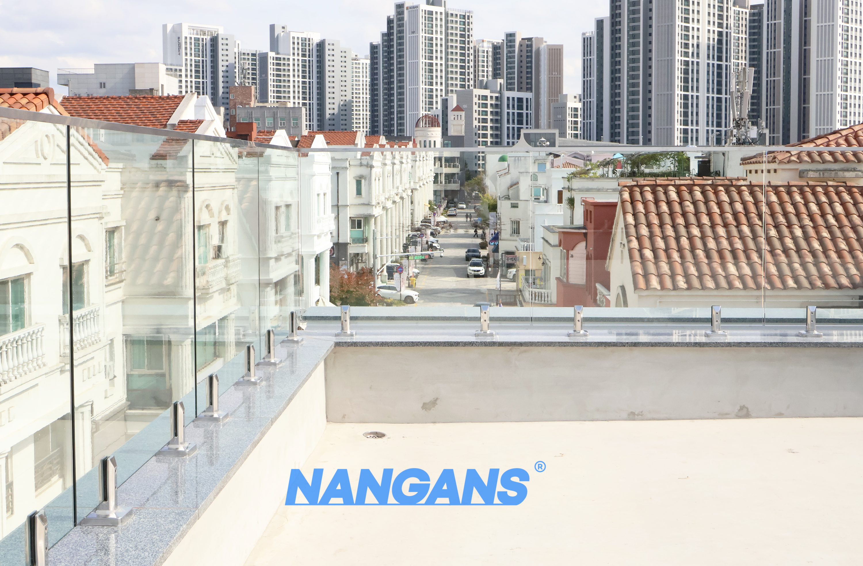 우선 지중해 마을은 이국적인 느낌의 건축물들이 밀집되어 있는 공간으로 건축물이 대부분 흰색이고 지붕은 황토색으로 통일된 정말 국내에서 보기 어려운 가로주택 구역입니다. 감각적이고 멋진 이 현장에 난간도 멋진 제품으로 설치한다면 금상첨화겠죠? 그래서 신축 현장에서도 선택한 난간이 바로 로켓형 포스트 구조의 유리난간 입니다.