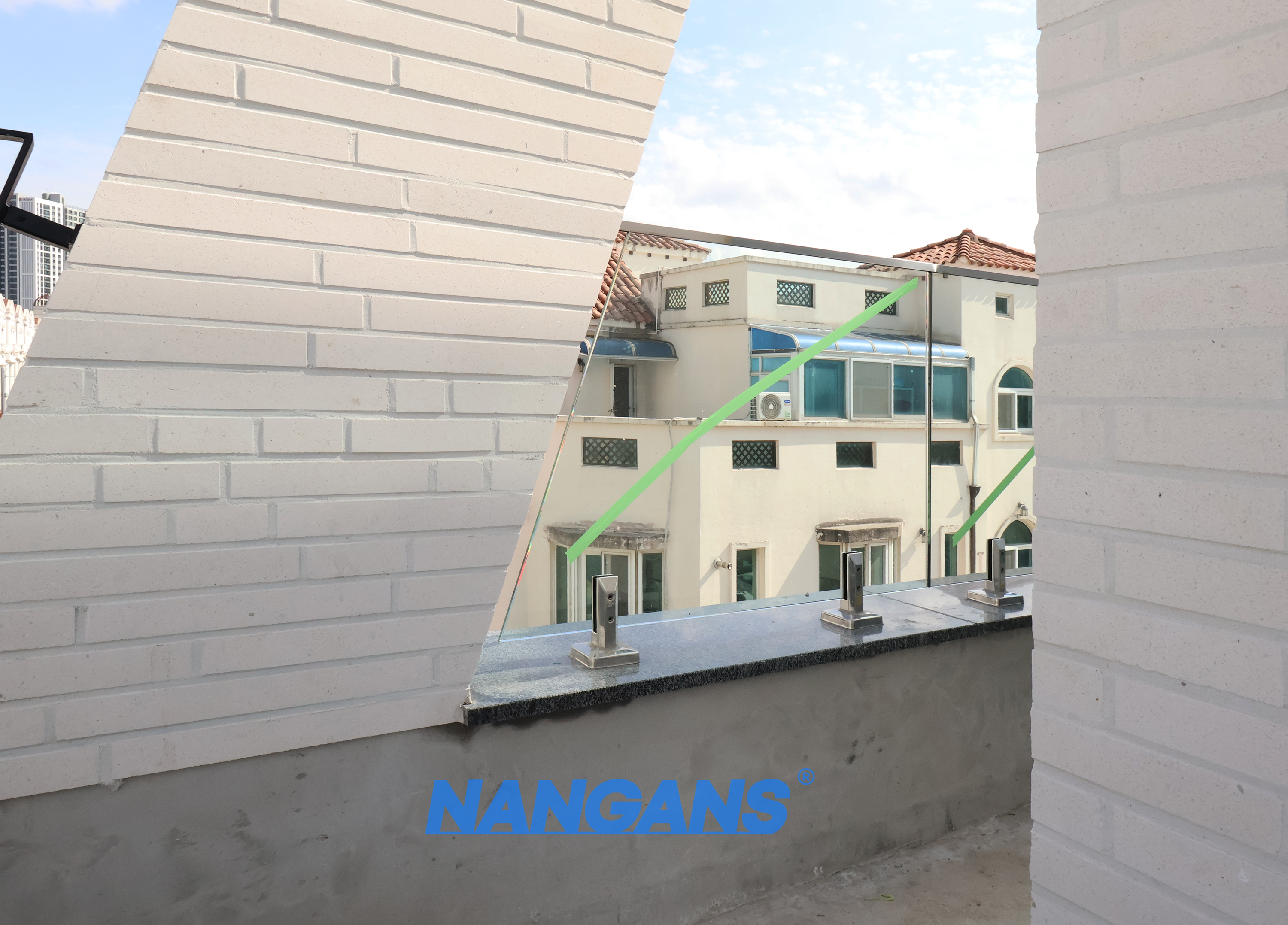 그럼 사이즈와 스펙에 대해 알아보겠습니다. 해당 층은 옥상이기 때문에 안전높이 1200mm 이상 되어야 하며 유리판의 무게와 내구성을 위해 1.2m의 가로폭 수준으로 재단하여 설치하는 것이 가장 좋습니다. 또한 옥상에 있는 빗물을 막는 파라펫이 이 약 50cm 가량 높게 올라와 있어 해당 높이와 난간의 높이를 함께 계단하여 안전 높이 기준을 준수하였습니다. 유리는 자세히 보시면 그린 컬러가 살짝 보이는 것을 확인하실 수 있습니다. 완전 투명이 아닌 그린 컬러의 농도가 조금 추가되었습니다.